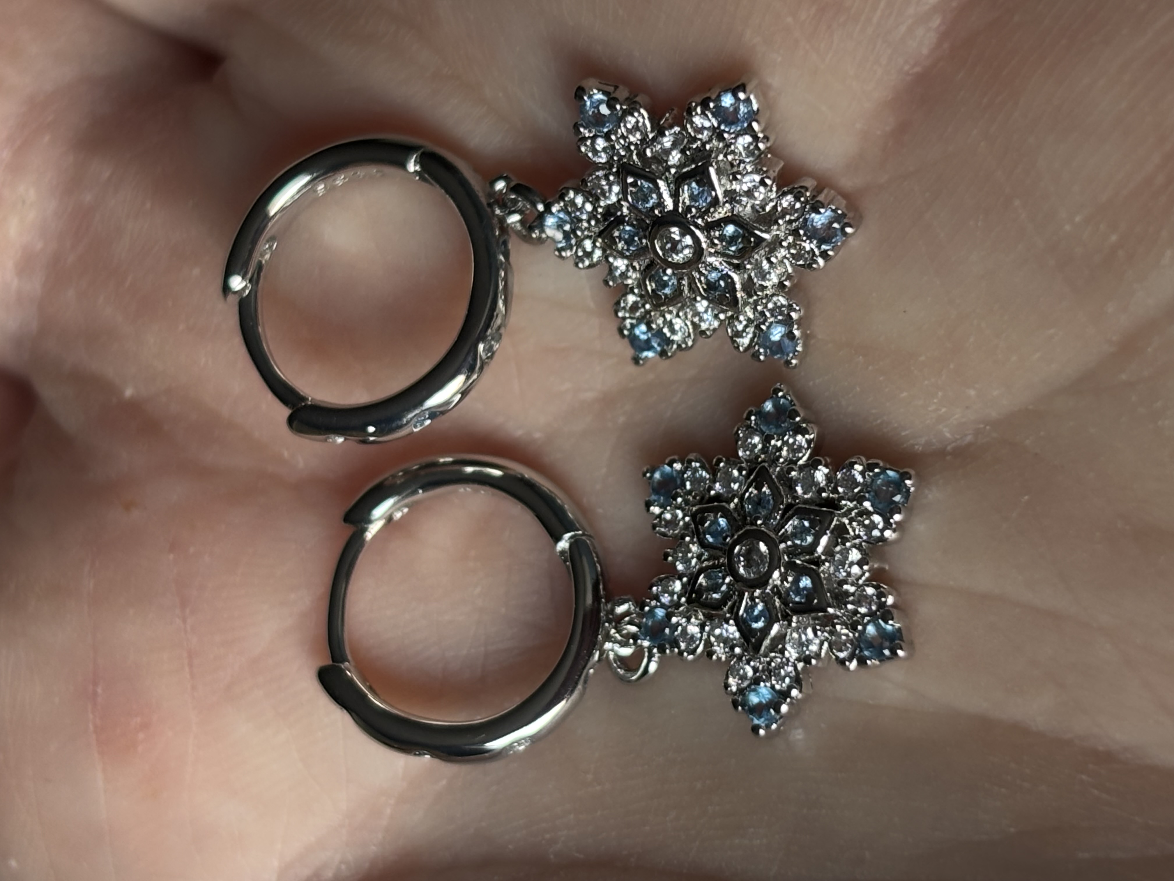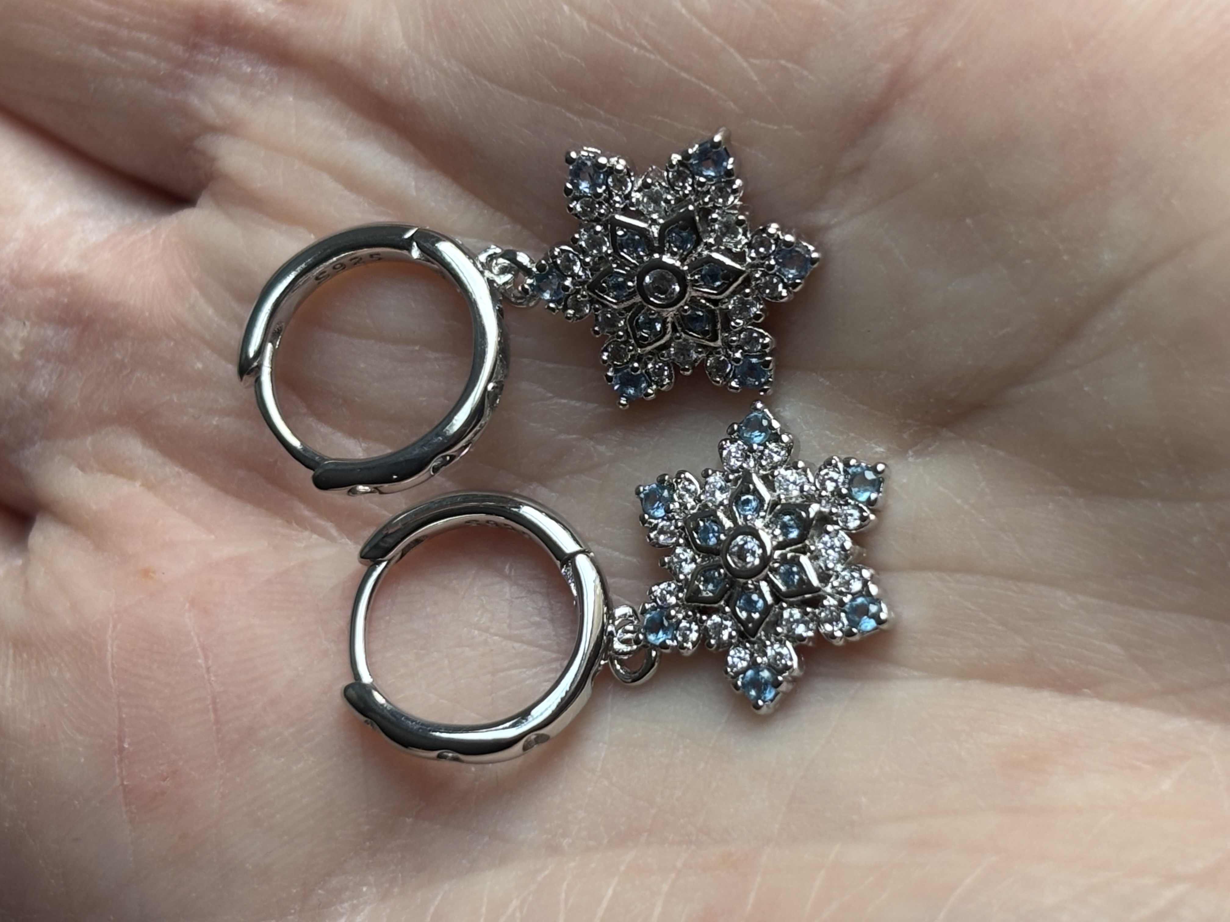 Sterling Silver blue & clear zircon snowflake dangle earrings in box