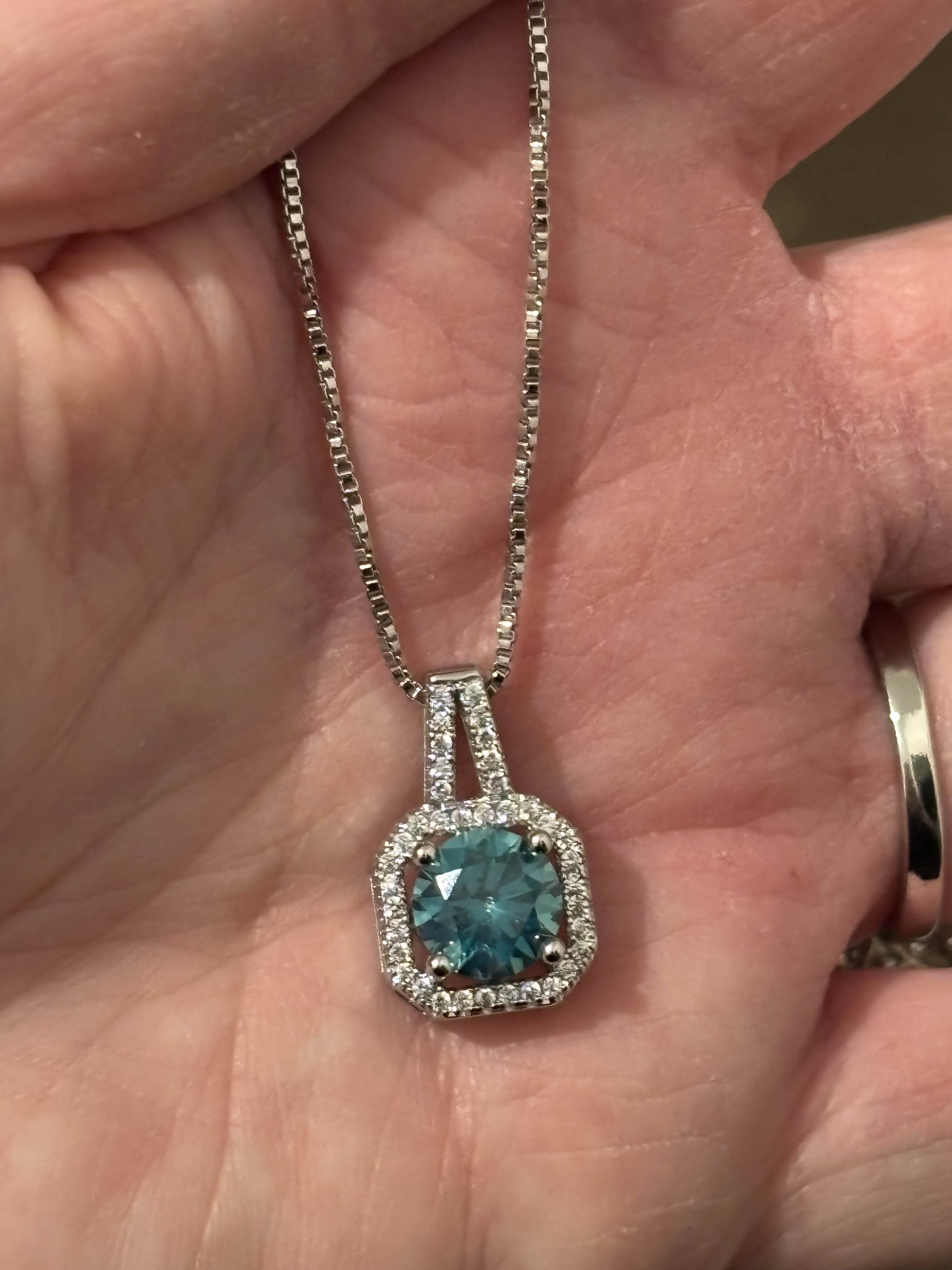 18 Inch (45cm) Sterling silver chain with PT950 platinum pendant containing a teal coloured Moissanite stone. Comes in luxury box