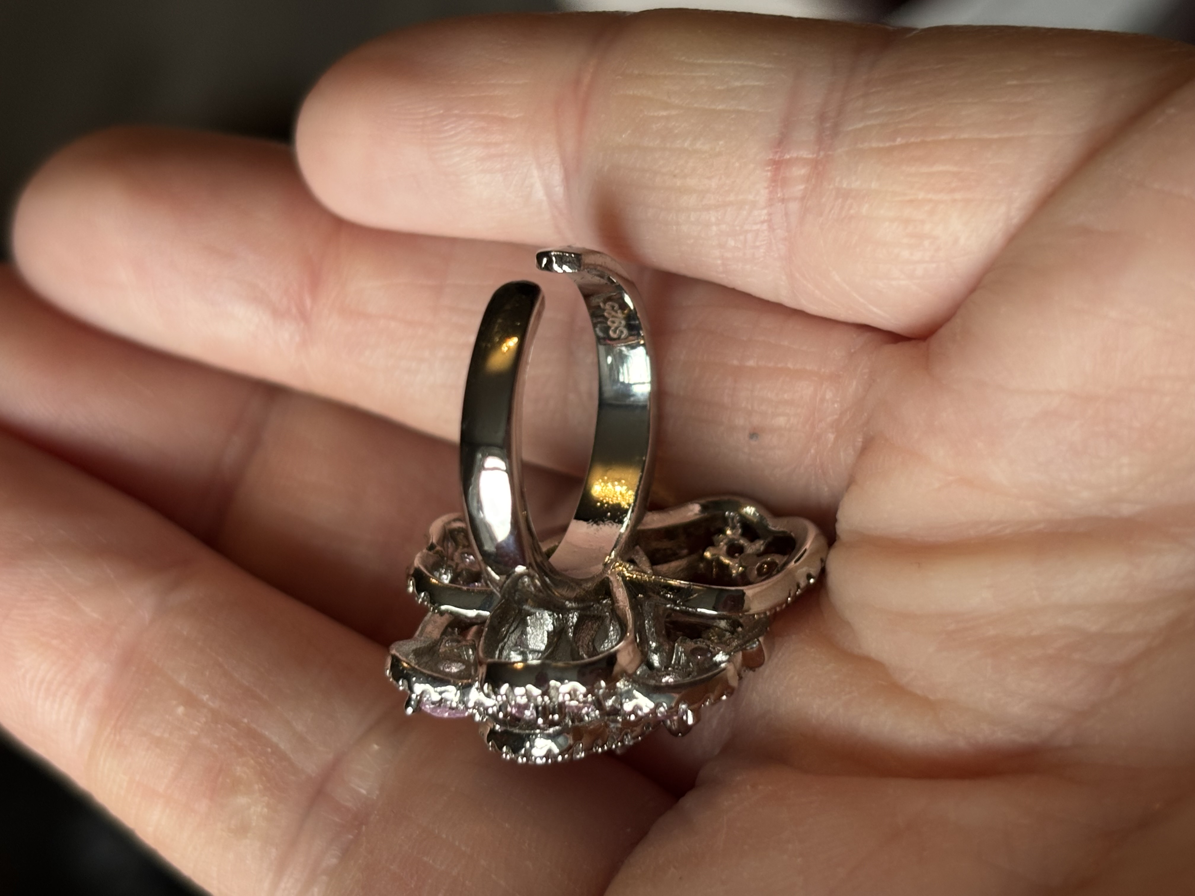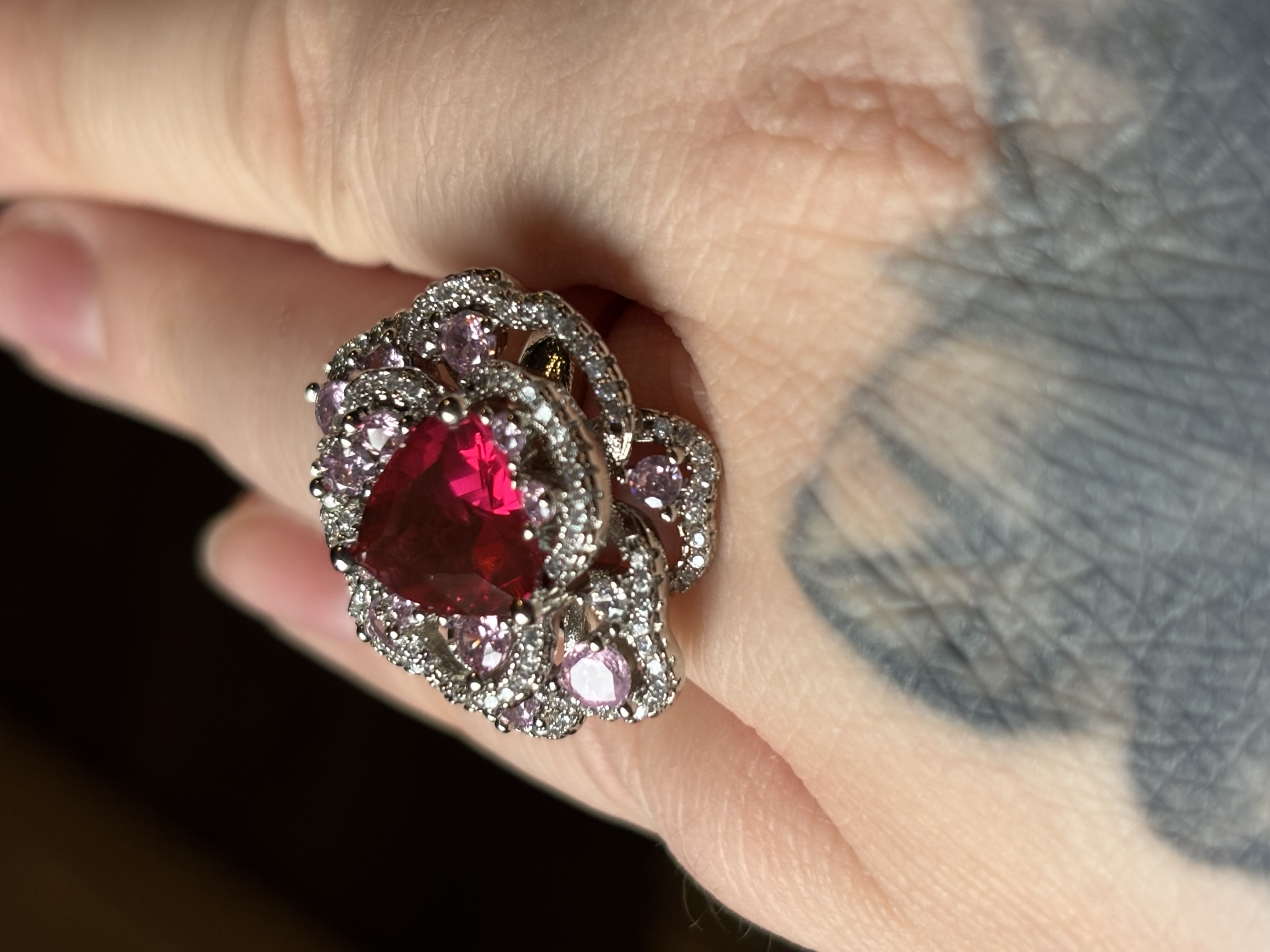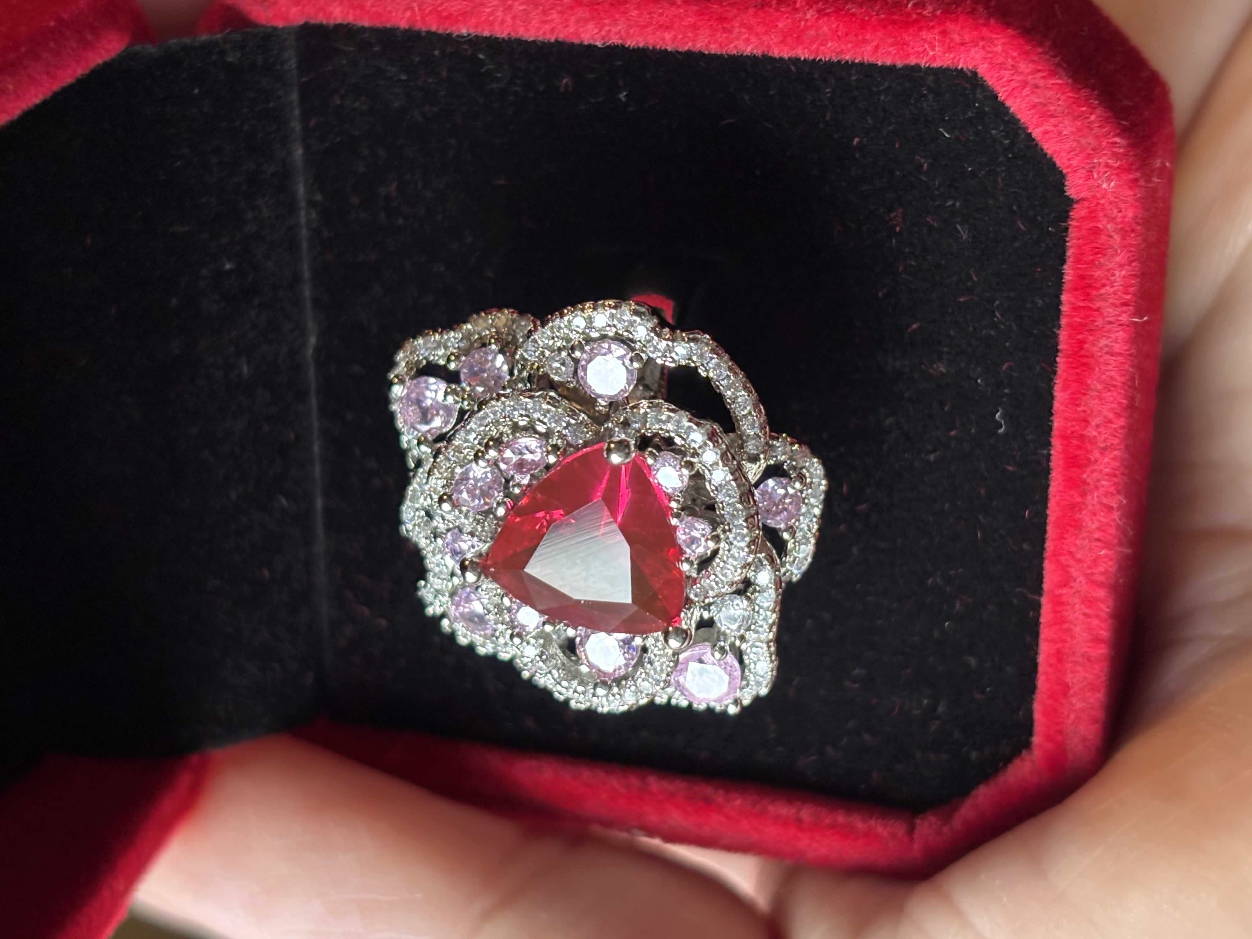 Sterling Silver Clear, Red & Pink Zircon Ring in box. Ring size is adjustable.