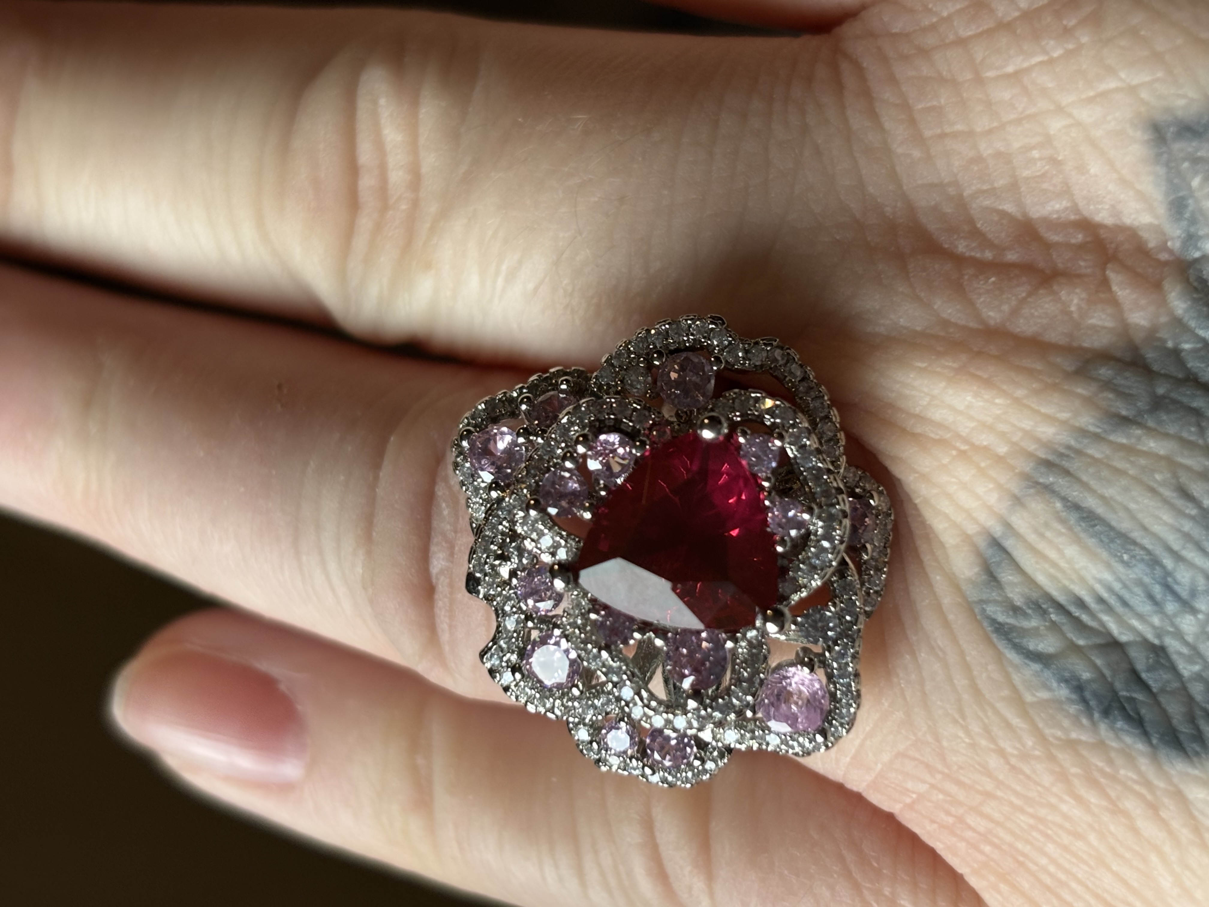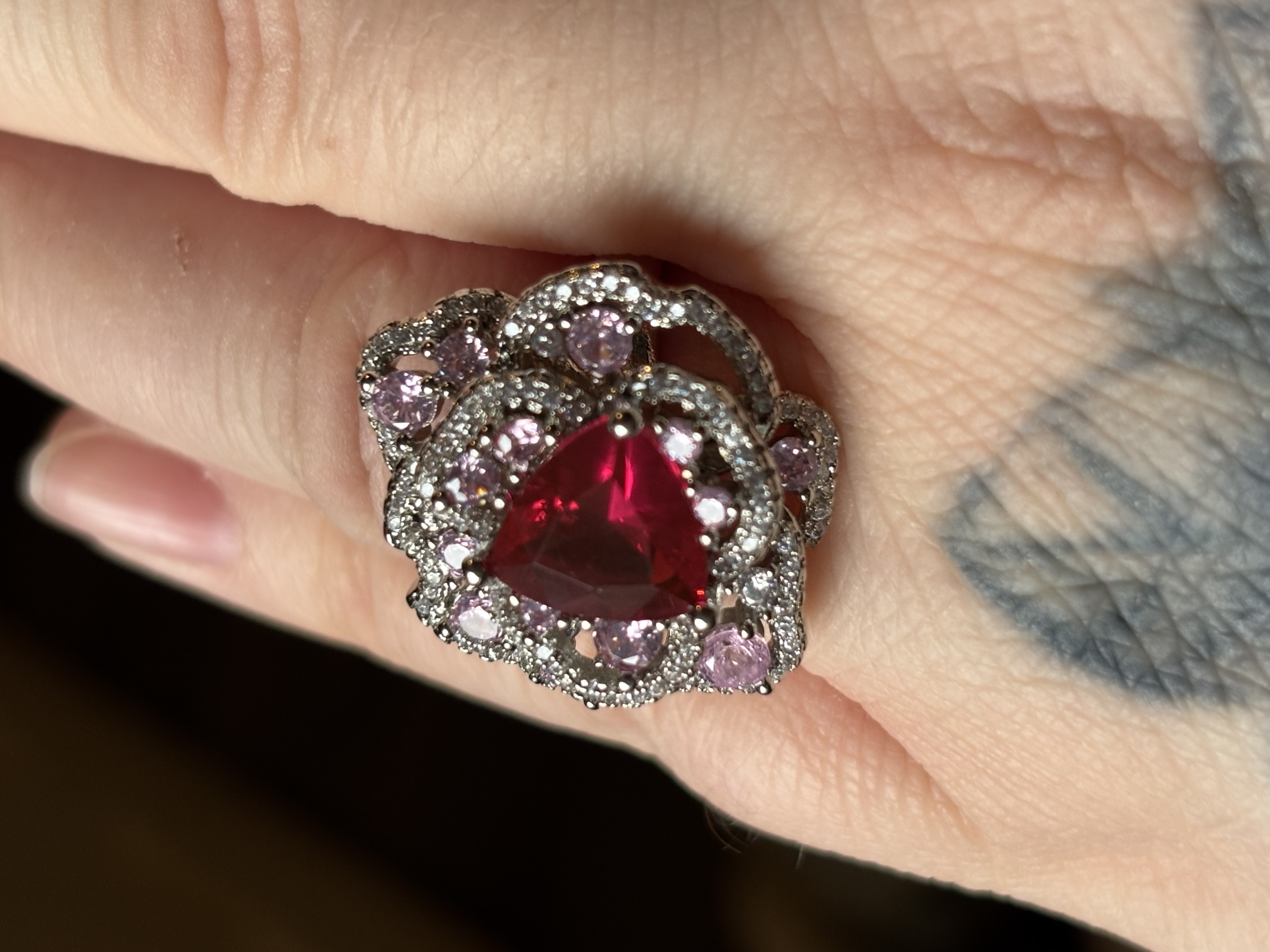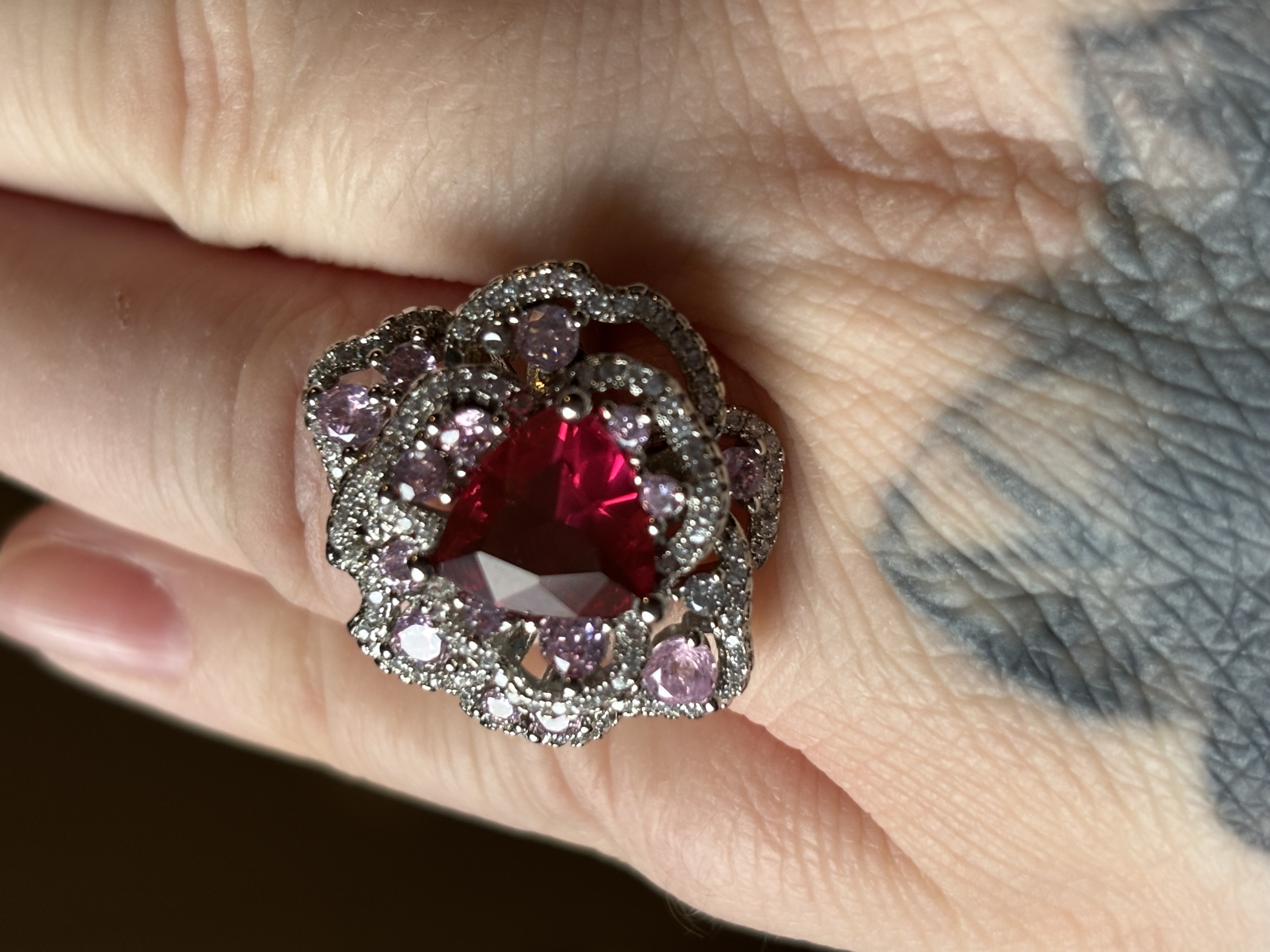 Sterling Silver Clear, Red & Pink Zircon Ring