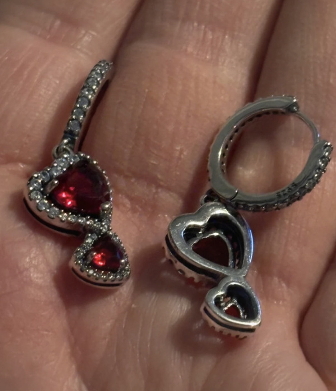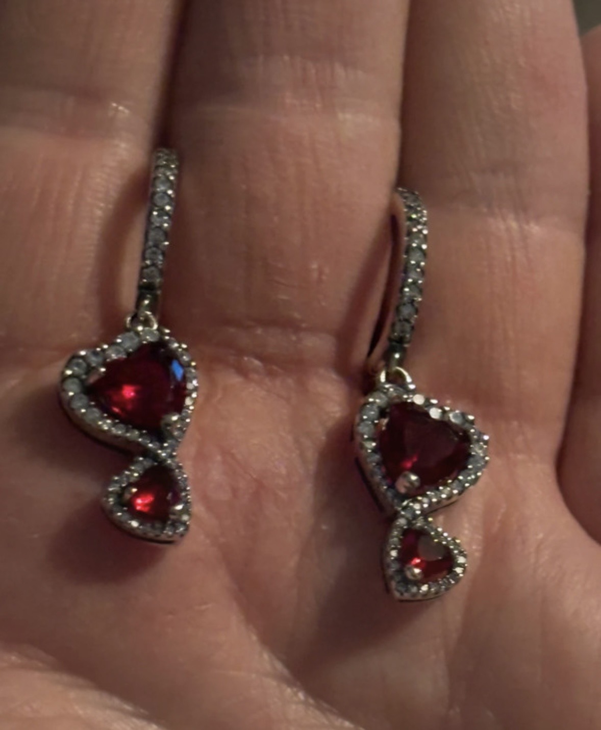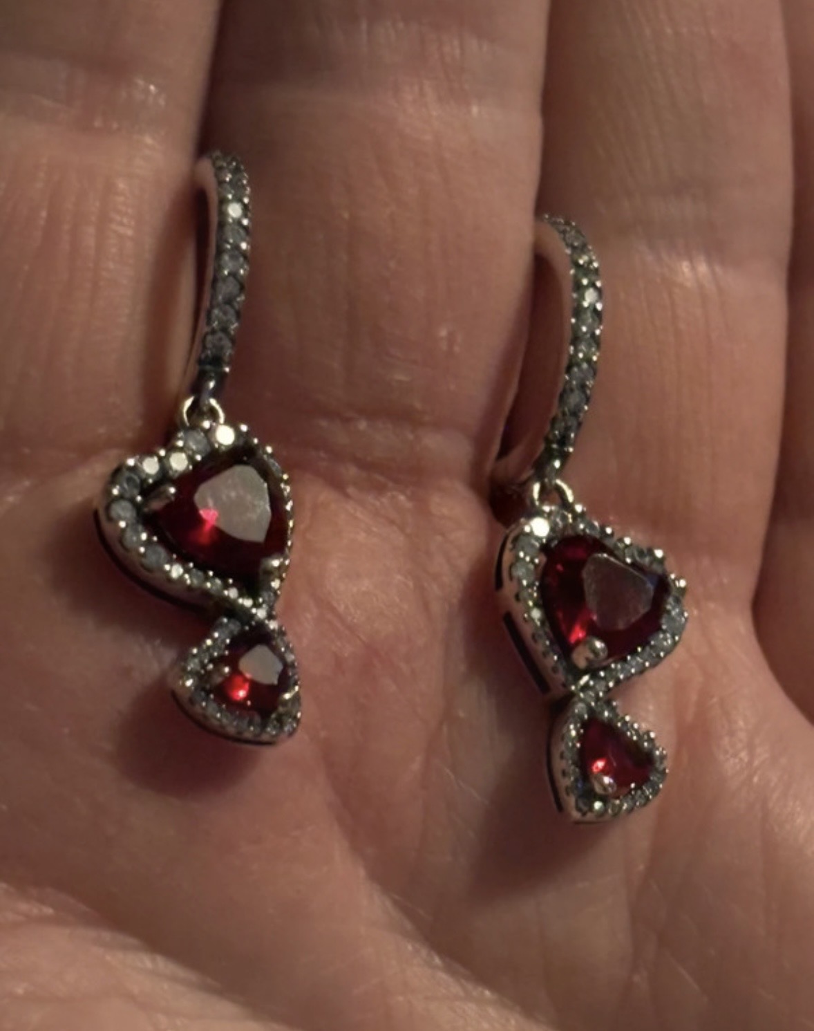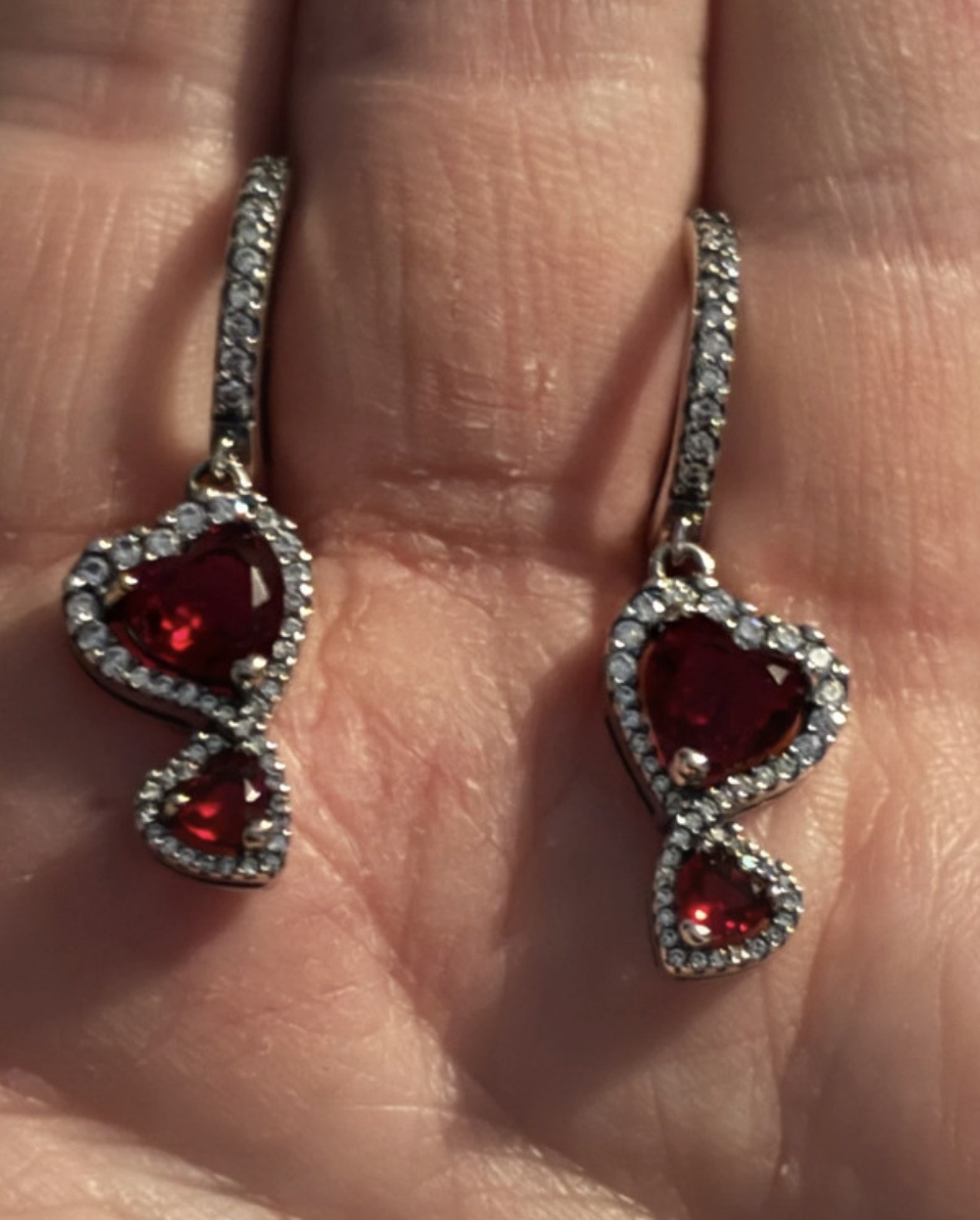 Sterling Silver Double Deep Red Heart Dangle Earrings In Box