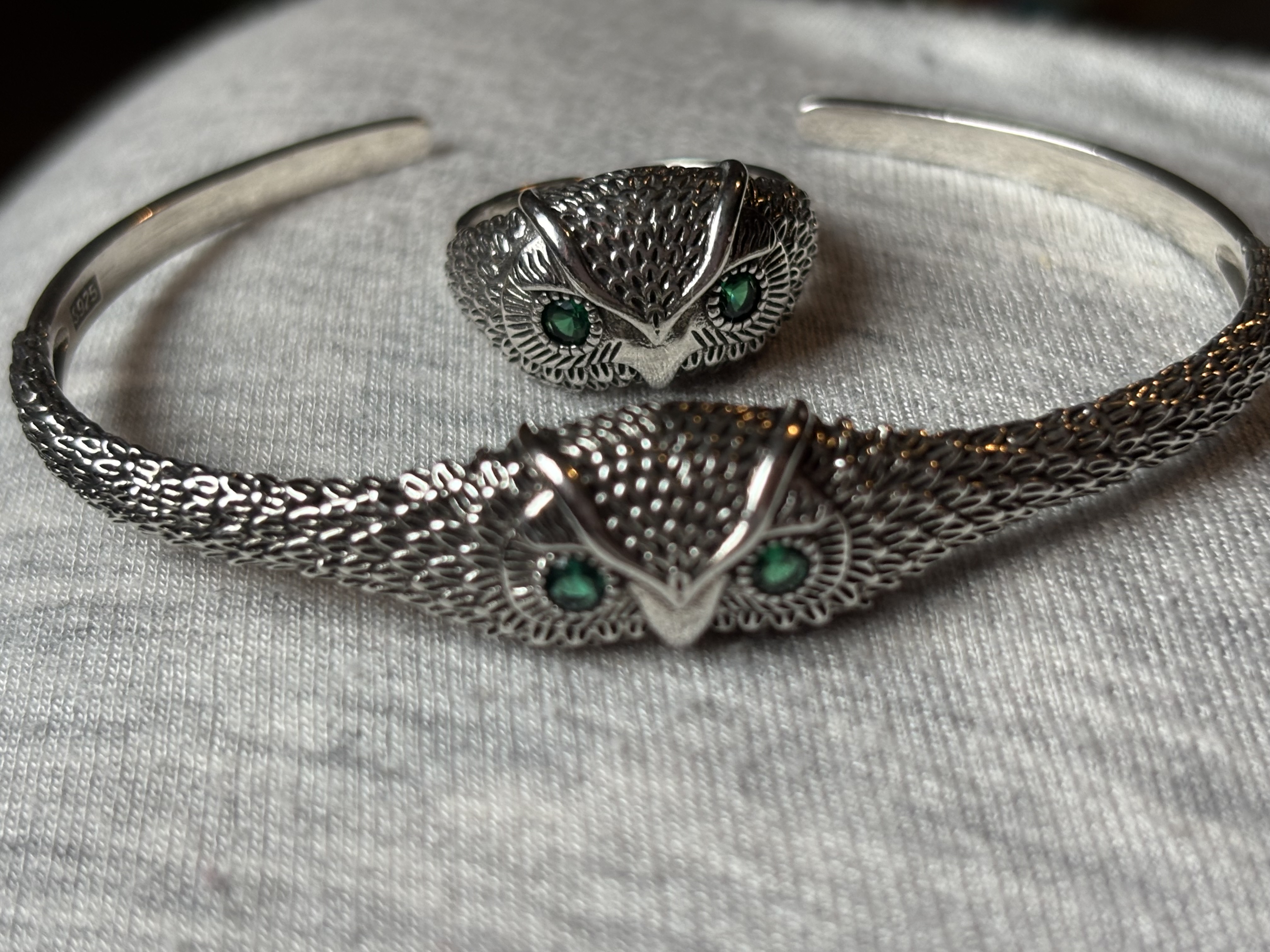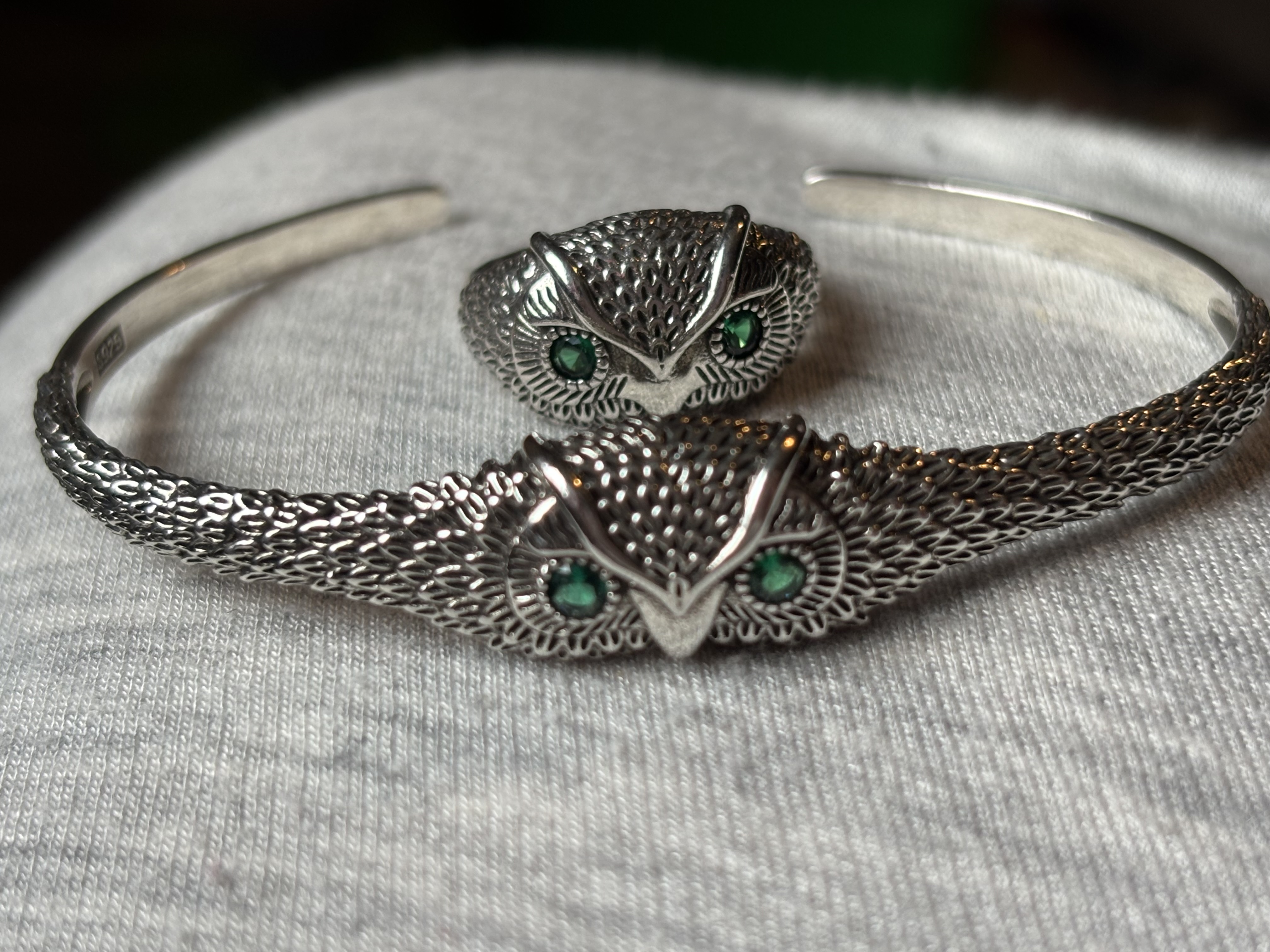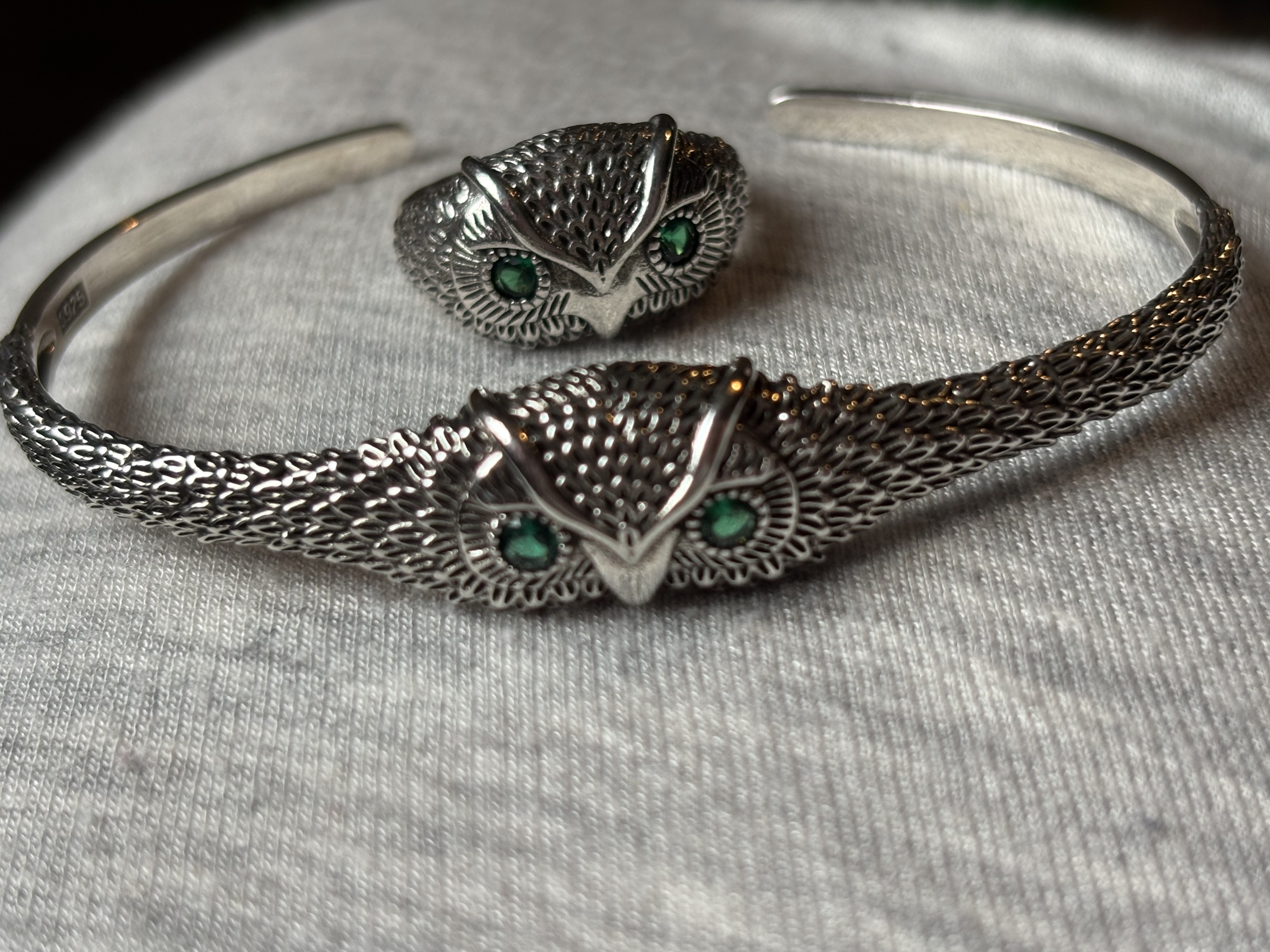 Sterling Silver Green Eyed Owl Adjustable Bangle & Matching Sterling Silver Owl Adjustable Ring