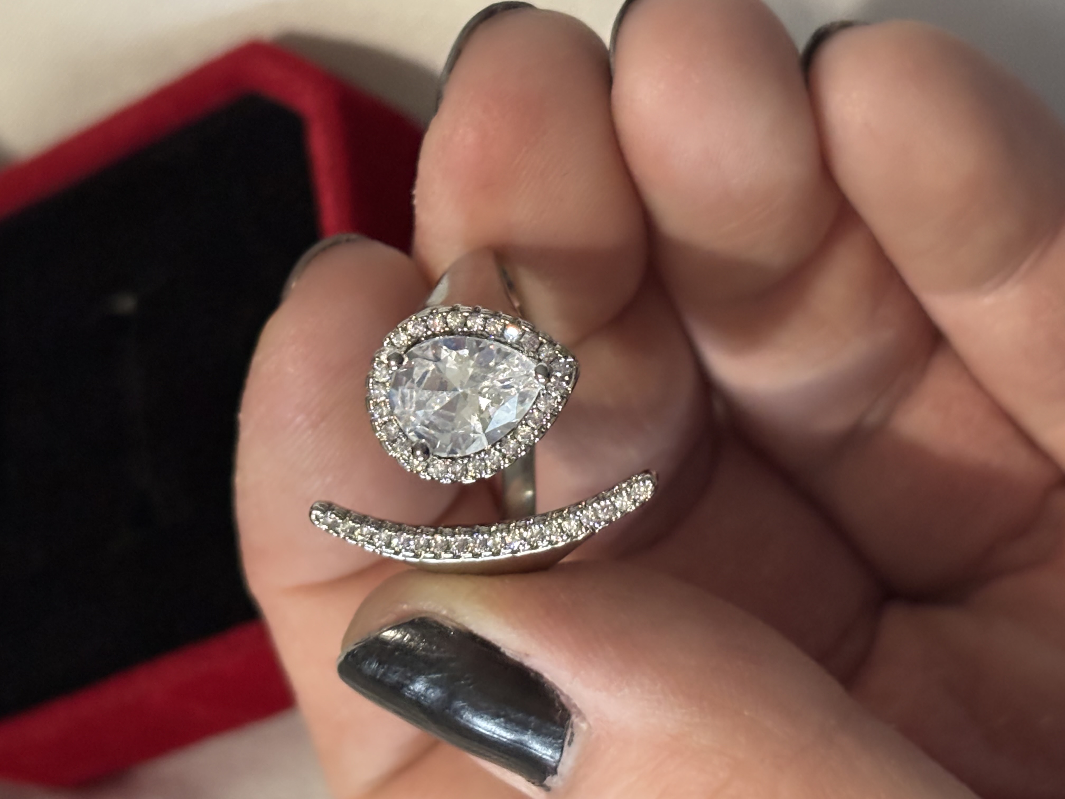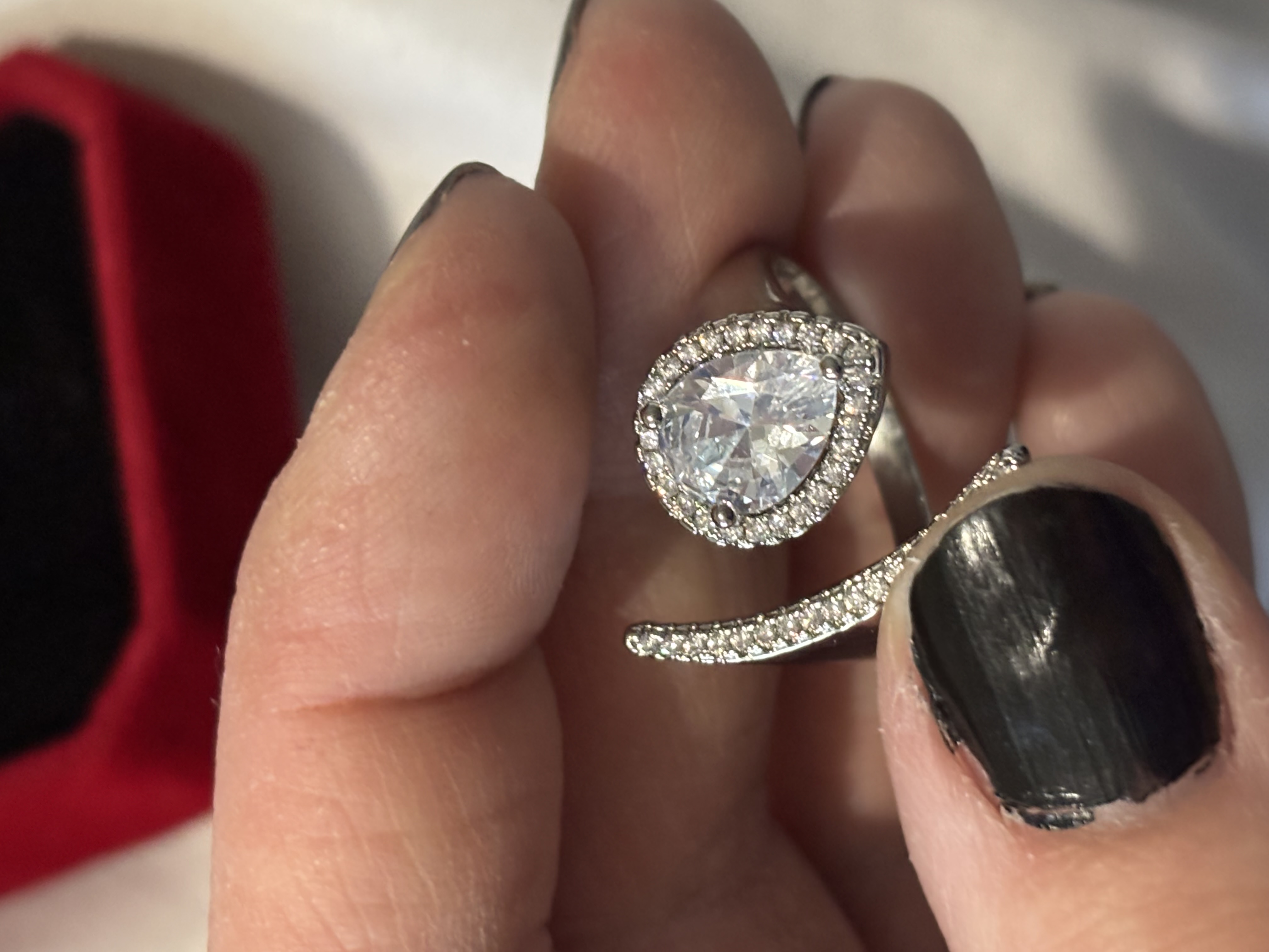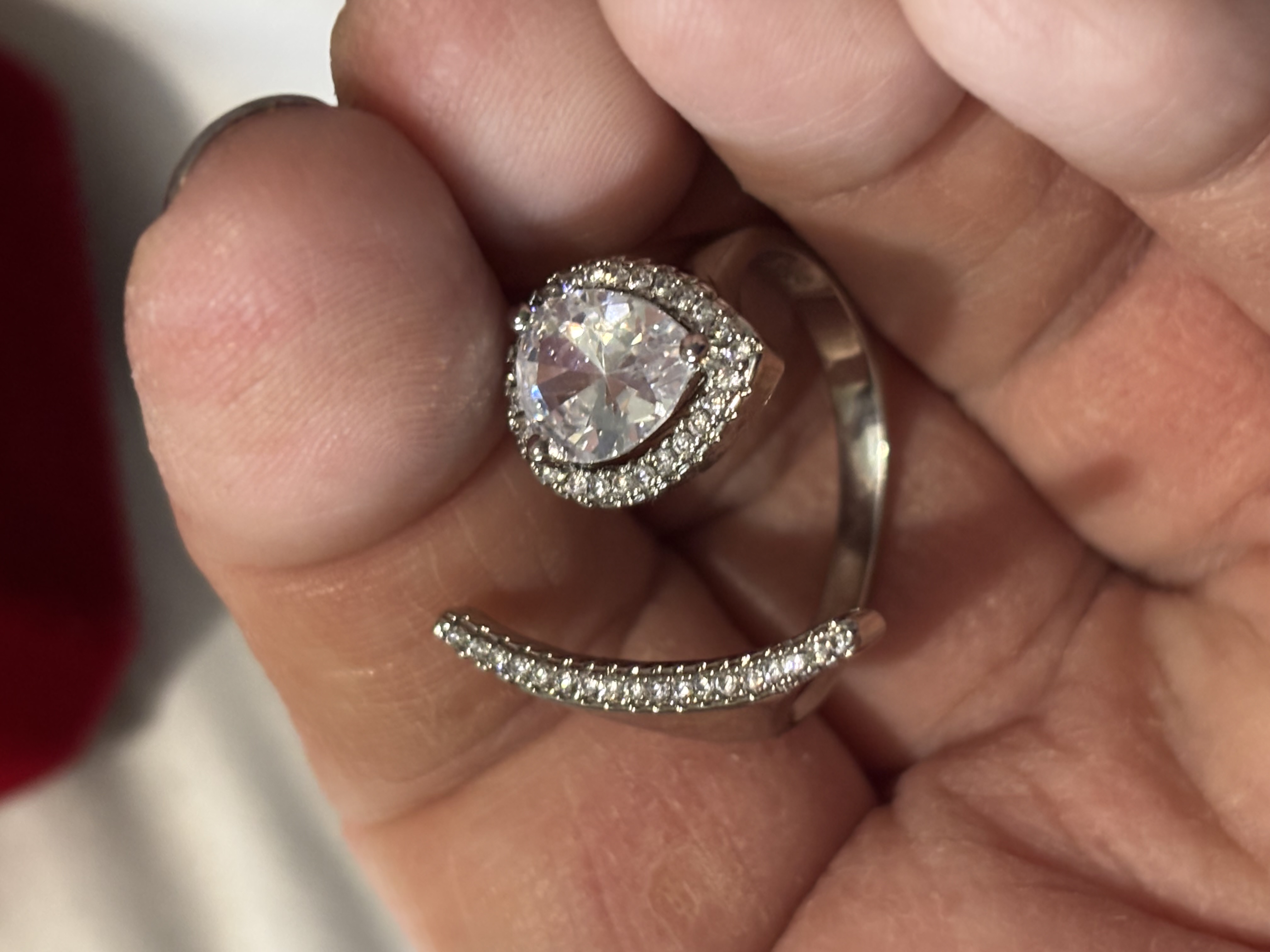 Sterling Silver Pear Shape Zircon Ring in box. Ring size is adjustable.
