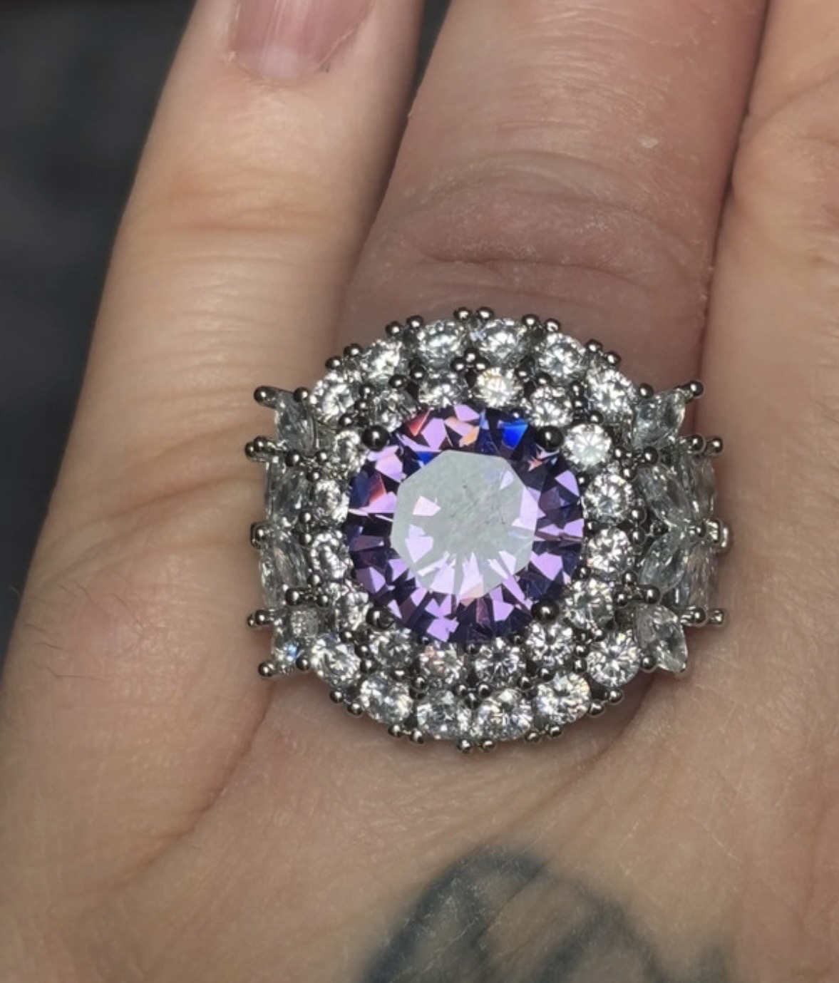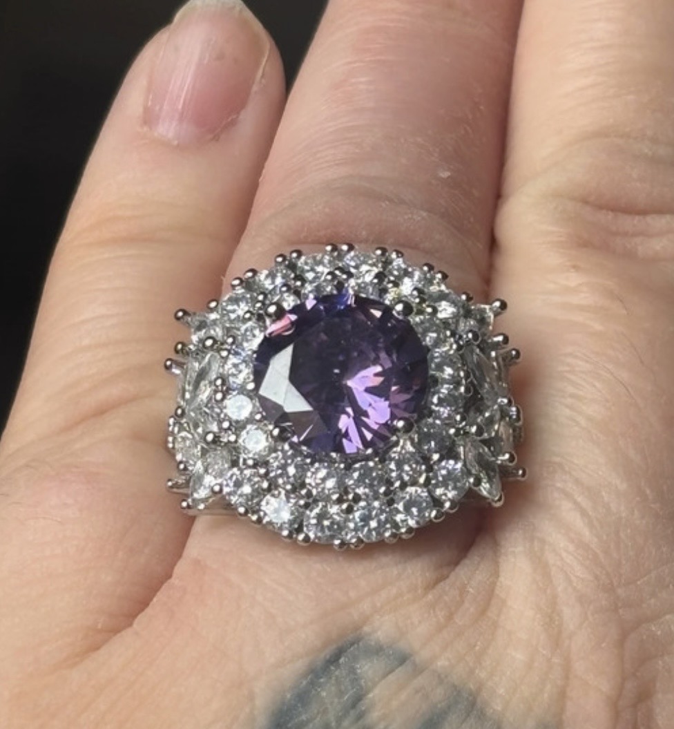 Sterling Silver Purple & Clear Zircon Statement Ring. Ring size is Adjustable.